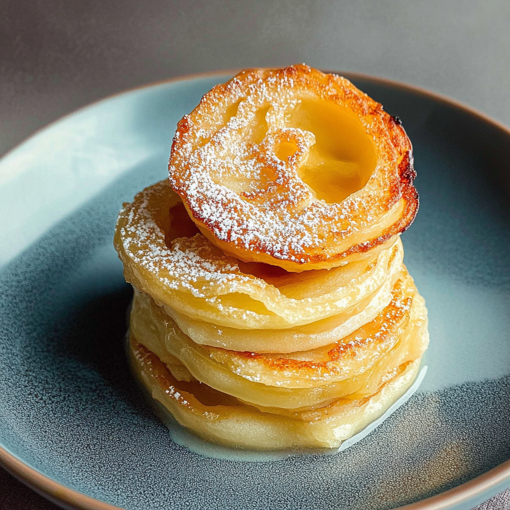 Die ummantelten Apfelringe in die heiße Pfanne geben und von beiden Seiten goldbraun braten. Achte darauf, dass du sie nicht zu lange brätst; sie sollten außen schön knusprig sein und innen saftig bleiben.